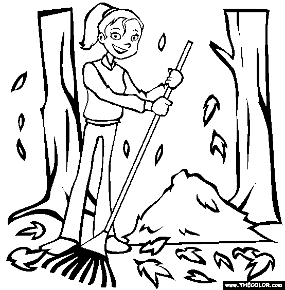 Raking Fall Leaves Online Coloring Page